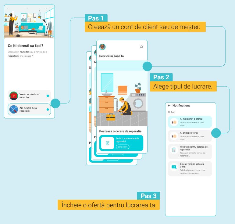Aplicația Ghiță are o interfață intuitivă și prietenoasă, care te va trece prin întregul proces în doar 3 pași simpli: intri în cont, alegi tipul de serviciu de care ai nevoie, trimiți cererea de reparație și de acolo se ocupă Ghiță.